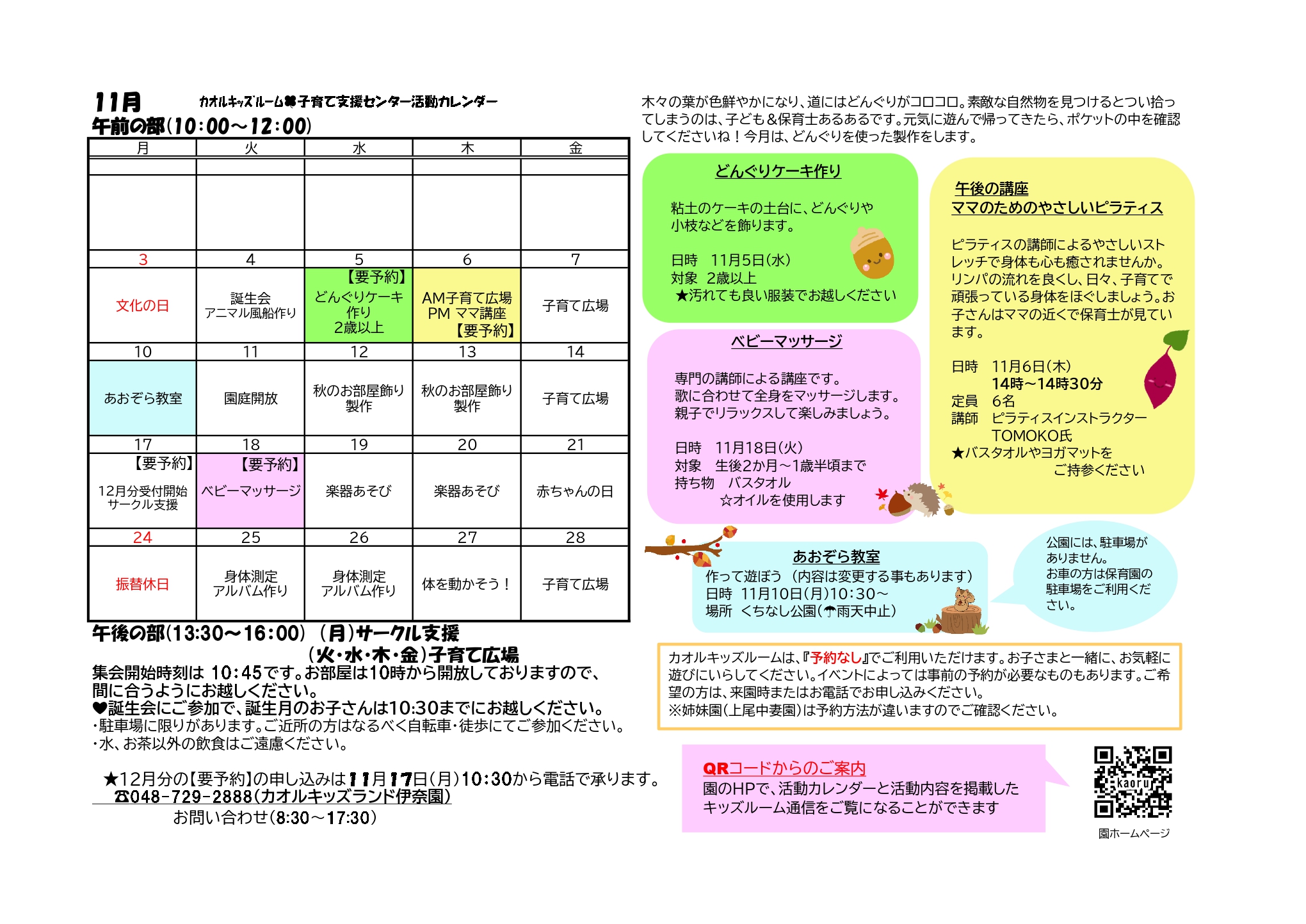 TEL 048-729-2888(カオルキッズランド伊奈園 子育て支援センター)